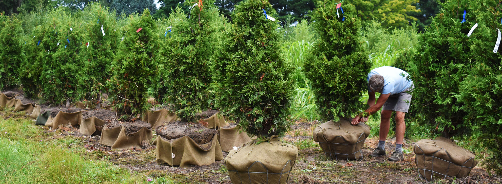 Our crew digs plants both by hand and with a tree spade machine. Root balls are packaged in burlap.
